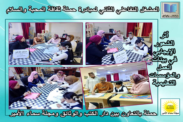 نظّمت منصة مبادرة حملة ثقافة المحبة والسلام، التي أطلقت بالتعاون بين دار الكتب والوثائق ومجلة سماء الأمير، صباح الأربعاء 24 أيلول 2025، المشغل التفاعلي الثاني تحت عنوان "بالمحبة نبني العراق.. أثر الشعور الإيجابي في بيئات العمل والمؤسسات التعليمية". وجمع المشغل فناني مرسم مكتبة الأجيال مع تربويات من مدرسة ابن البيطار الابتدائية، بدعم من المدير العام للدار السيد بارق رعد علاوي.